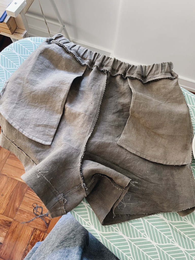 Já as receitas dos séculos XVII e XVIII, para obter preto, incluíam taninos e ferro. Assim, tal como acontece com as bolotas e outras partes do carvalho, por exemplo, os taninos das azedas vão reagir com o sulfato de ferro, após o tingimento, e transformar a cor do tecido de tons terra, para tons mais frios, cinzentos. Foi assim que a cor do linho, que usei neste projecto, foi criada. Um tecido guardado durante mais de dois anos, desde esses dias de espera, quase 40 semanas de gravidez, até ao momento de transformação numa peça de roupa, agora há poucas semanas. Fiz os meus primeiros calções, a partir deste molde, e têm-me acompanhado, muitas vezes, nestes dias quentes, em que encontro outras azedas espalhadas pelos campos do país.