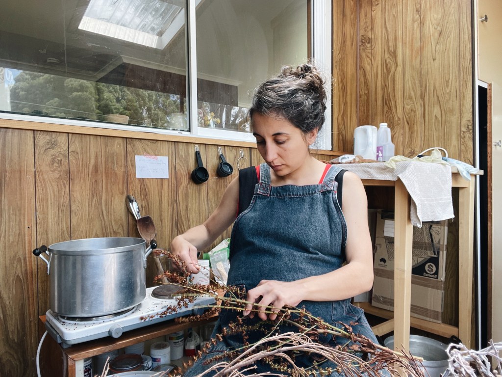 Num dos primeiros contactos que tive com a tinturaria natural, a minha professora disse que também ela nunca mais olhou para a Natureza da mesma forma. Acredito que tornar-me tintureira reparou a minha relação com o mundo natural, tanto quanto a maternidade, que de uma outra forma, igualmente poderosa, me devolveu aos campos, descalça, e aos percursos atentos a cada folha recortada na paisagem, ao mais pequeno dos bichos, e à cor dos campos salpicados de flor.